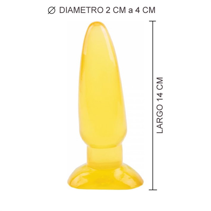 Este plug grande amarillo es el dilatador anal que buscabas, mide 14cm de largo y 4cm de ancho en su parte más ancha y 2cm en su punta, su forma cónica te garantiza una penetración cómoda y sin riesgos de dolor.